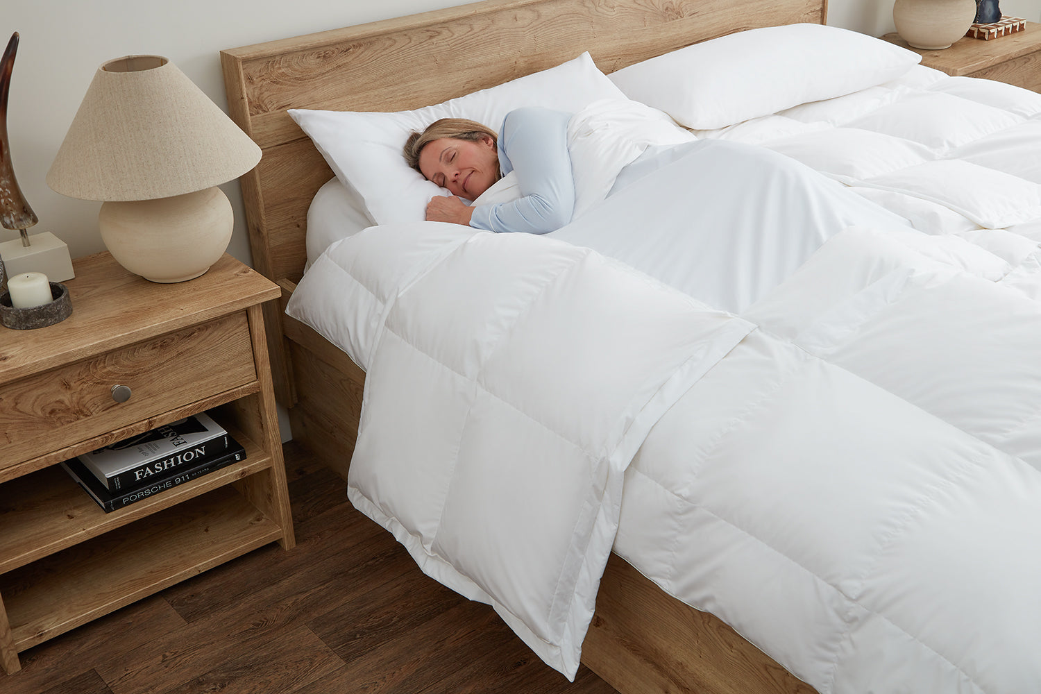 Sleeping Dove keeps couples close together under the same comforter. With individual windows at the midsection and foot, each sleeper can adjust their temperature without disrupting each other. No need for separate bedding.